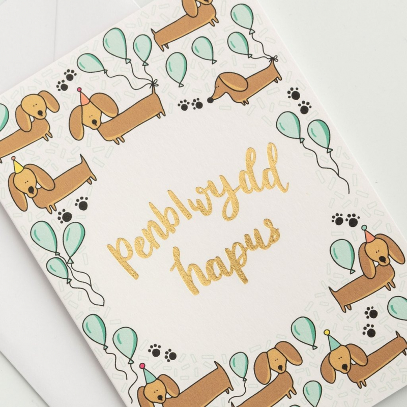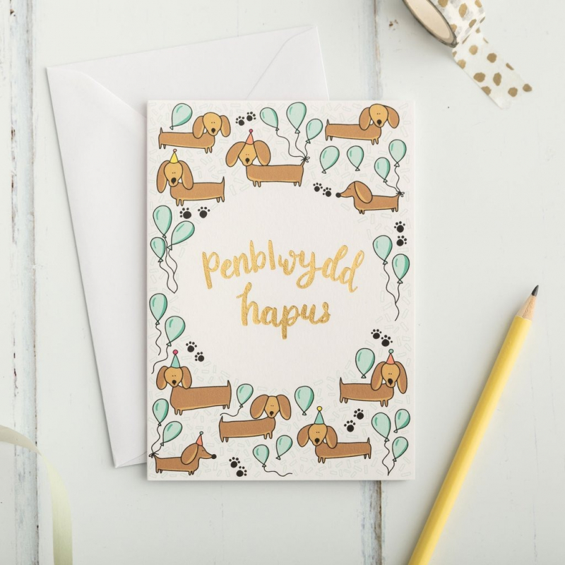 This card features hand written text and an original illustration of sausage dogs celebrating a birthday party! 'Penblwydd hapus' is Welsh for 'Happy birthday' and is finished in gold foil.