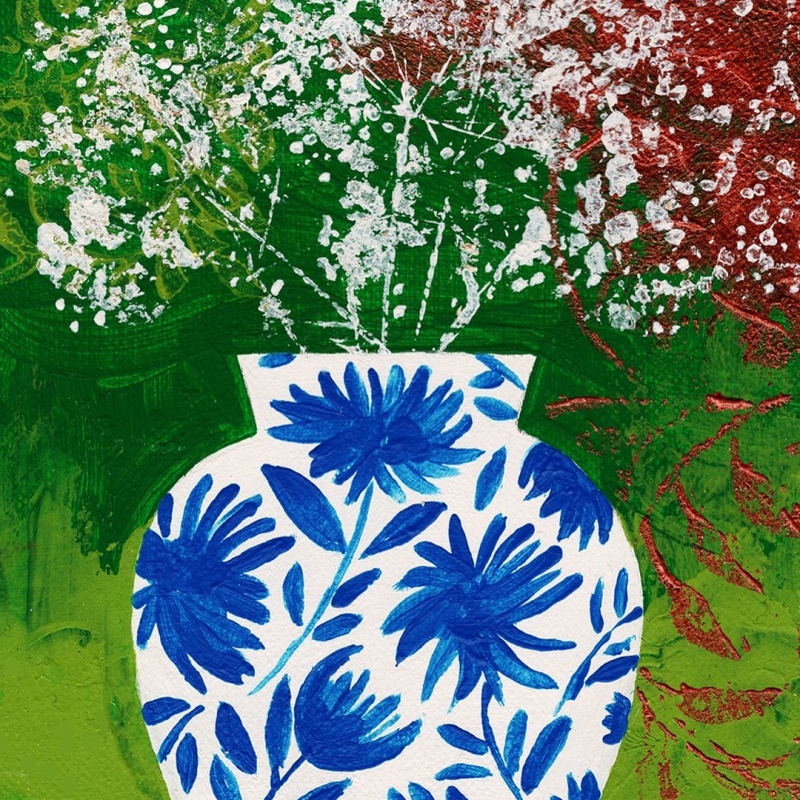 Mounted original mixed media: acrylic paints/emulsion paint/cyanotype/collage/ monoprint/woodblock print. Fits 7x7 inch frame. Image size approximately 100x100 mm.