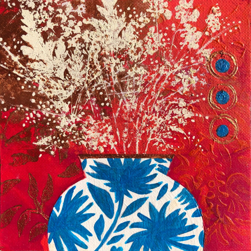 Original mixed media: acrylic paints/emulsion paint/monoprint/woodblock mounted print. Fits 7x7 inch frame. Image size approximately 100x100 mm