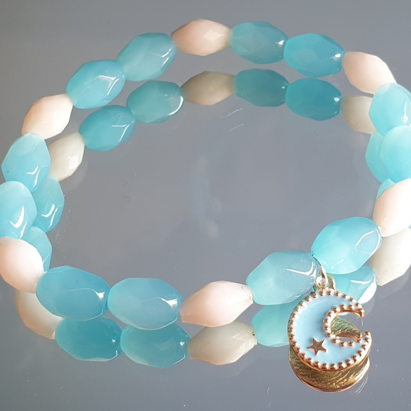 Bracelet made with upcycled blue and white beads and a blue moon charm.