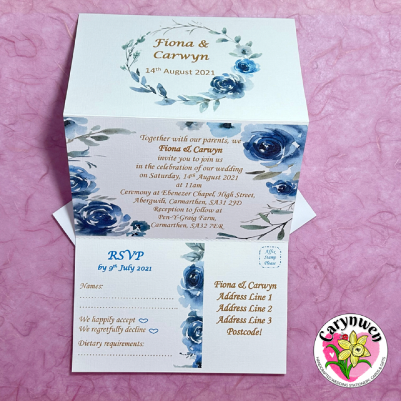 Introducing "Cariad Rhosyn Glas" – a stunning Welsh-inspired wedding invitation designed to capture hearts. This tri-fold invitation features an exquisite blue rose motif, symbolising love and romance. Crafted with meticulous attention to detail, each invitation is printed on high-quality linen card-stock and includes a tear-off RSVP card for added convenience.