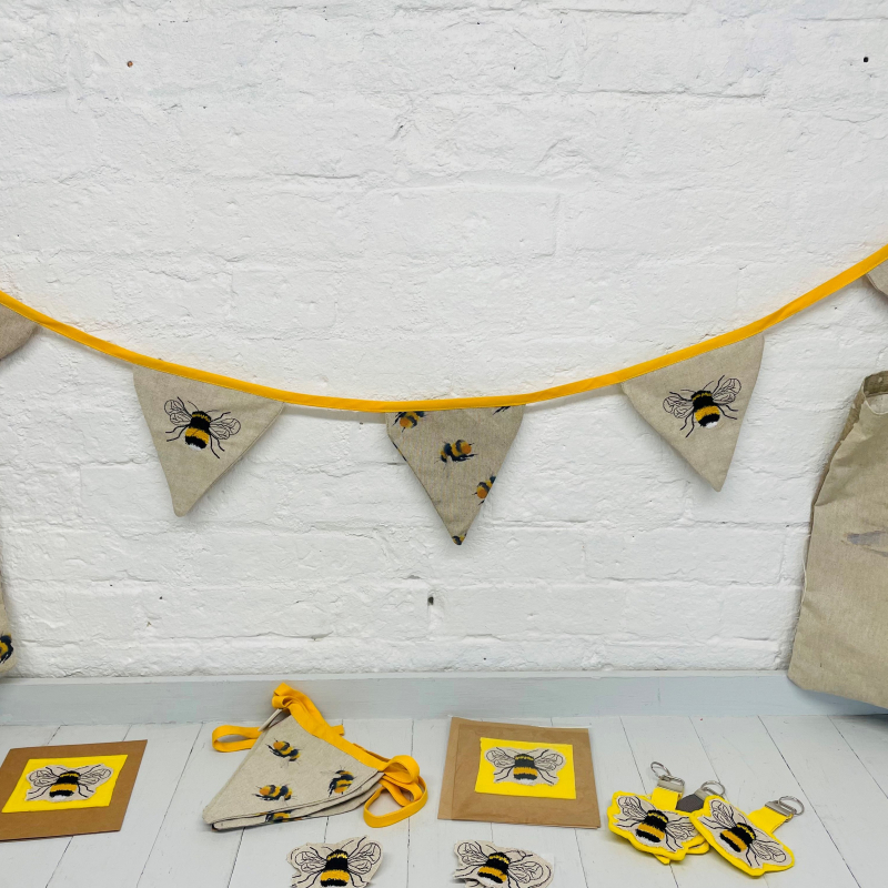 A super cute 5 Flag bee bunting . The bunting is approx 1M with extra on each end for hanging. The cute bumble bee is embroidered on alternate flags bee fabric in the other . Bunting flags are approx 7” and come on mustard bias binding.