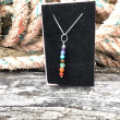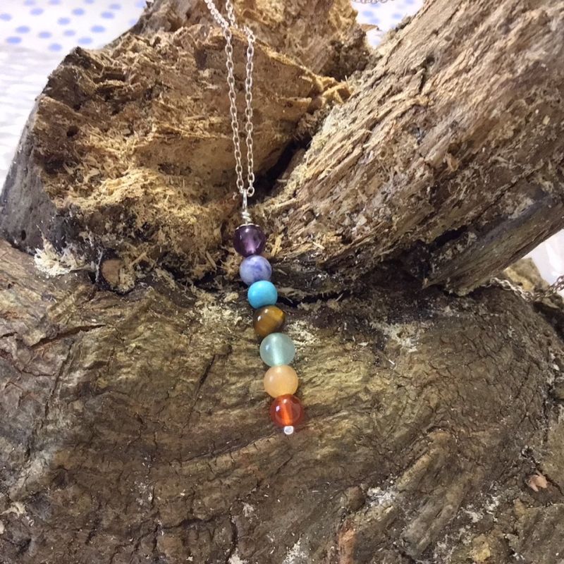 A beautiful Gemstone beads Chakra pendant. A chakra bead drop style pendant. sterling silver drop chakra pendant.The 18" chain is ,genuine sterling silver.The pendant are made with genuine 4.m.m.gemstone beads.The 7 beads that are included are: