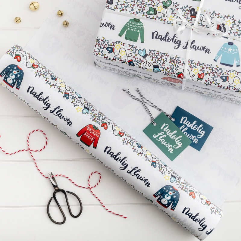 This set features original illustrations with Christmas jumpers and lights. Nadolig Llawen is Welsh for Merry Christmas.