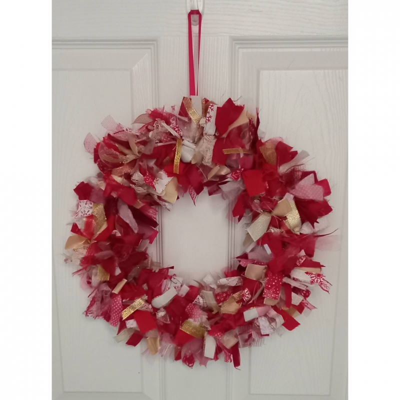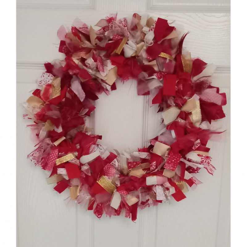 Perfect for any Christmas decoration scheme. This beautiful handmade round rag wreath features white, gold and red fabrics. Unusual and unique - there are 2 available in this colour scheme but as they are hand tied and use some different fabrics they are definitely not the same.
