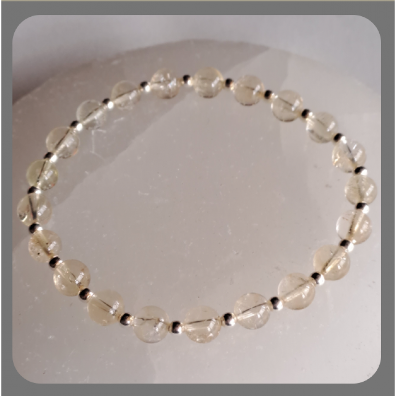 It is made using strong jewellery elastic, and it is best to roll it on instead of stretching. The citrine beads are about 6mm and the sterling silver beads are 3mm.