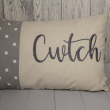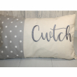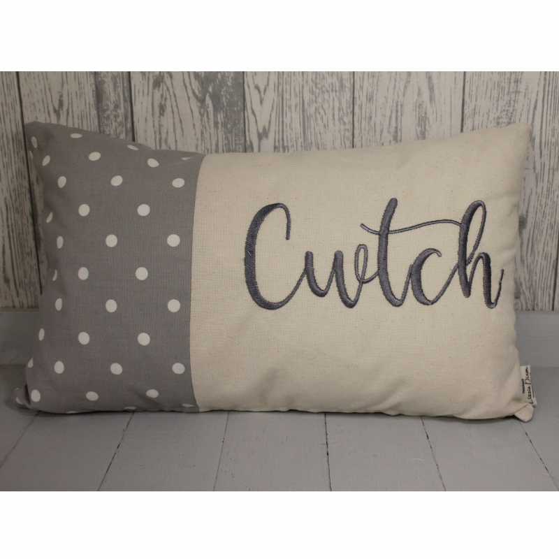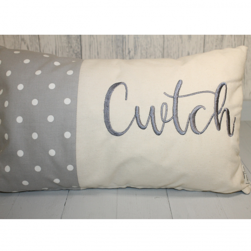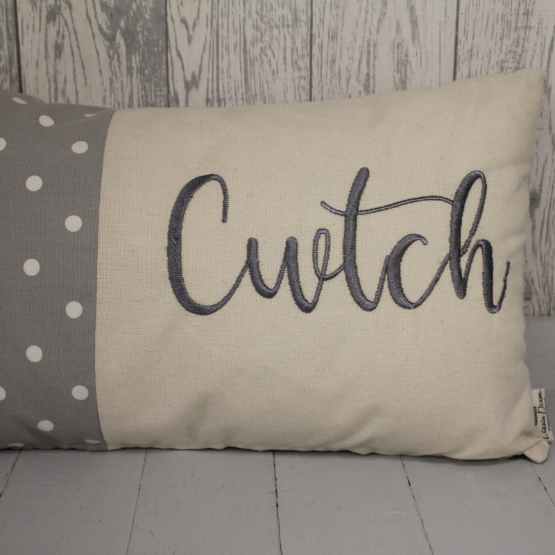 The word Cwtch is Embroidered in mustard, on a cream panel with a mustard dotty fabric to the side and back. Each cushion has been finished with a zip fasting along the bottom and comes with a premium hollow fibre pad.