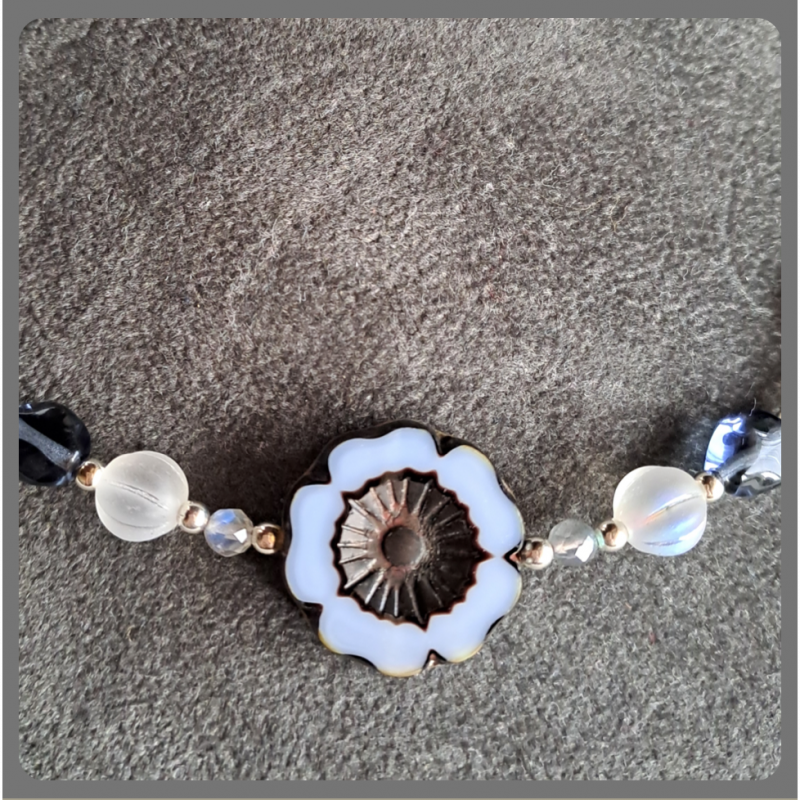 Blue, Grey and Silver Czech Glass Floral Necklace with Labradorite and sterling silver.
