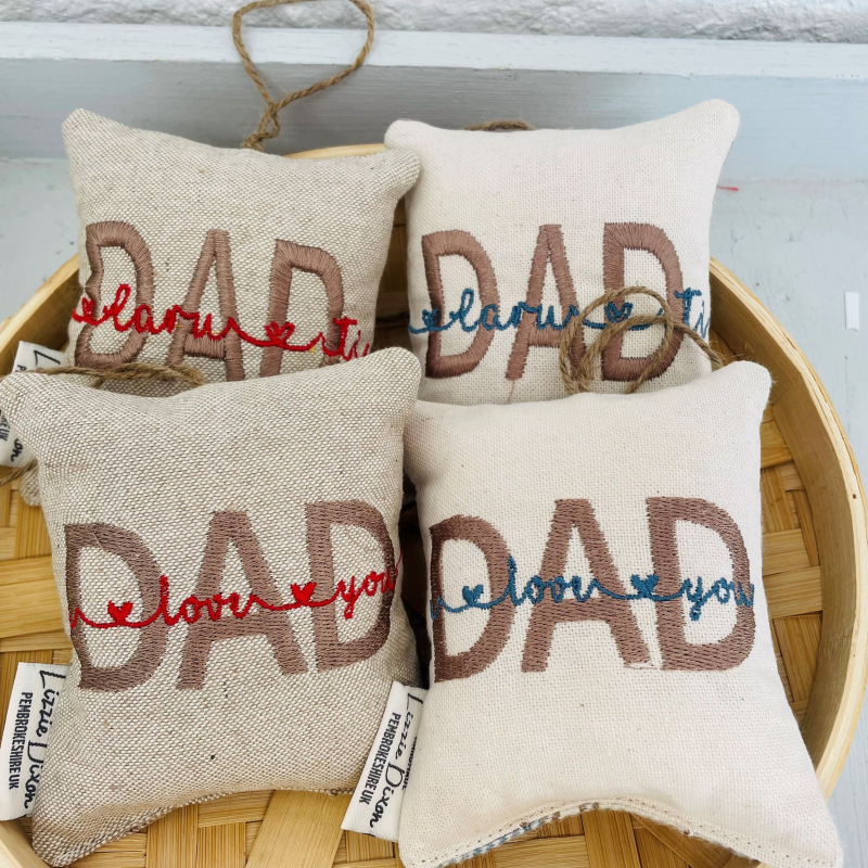 This cute Father's Day hanging decoration is super cute, with DAD I love you in welsh or English on a cream front with the wool fabric on the back.