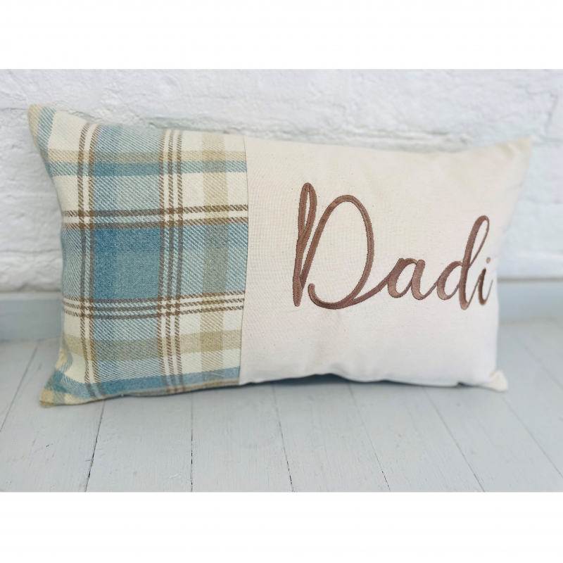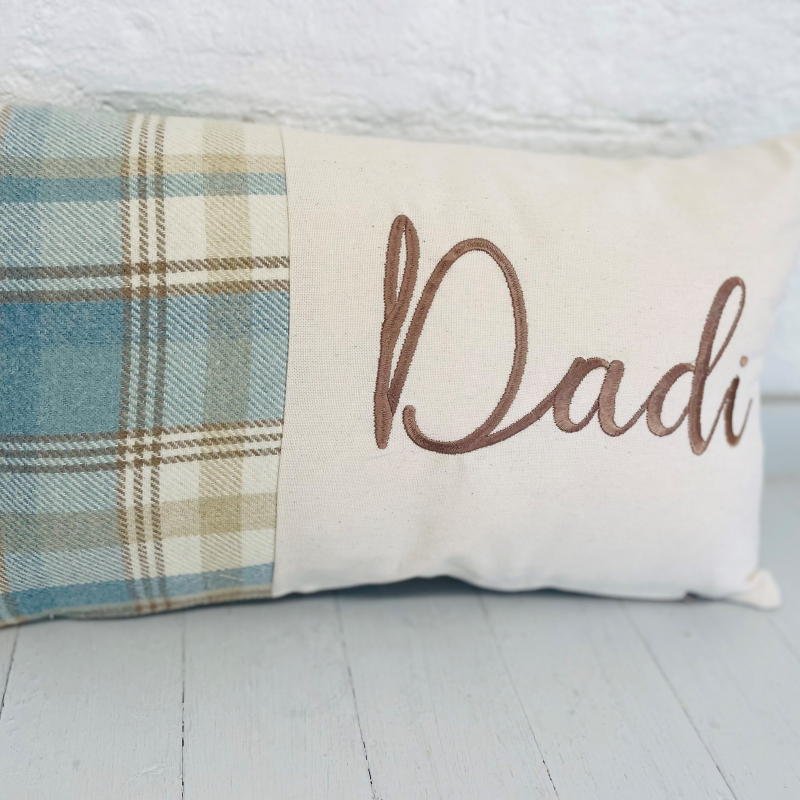 Can be personalised with any name , embroidered on a panel with the blue wool touch fabric on the side and in the back .