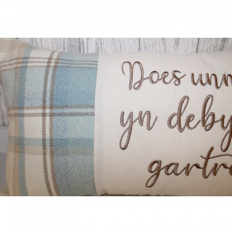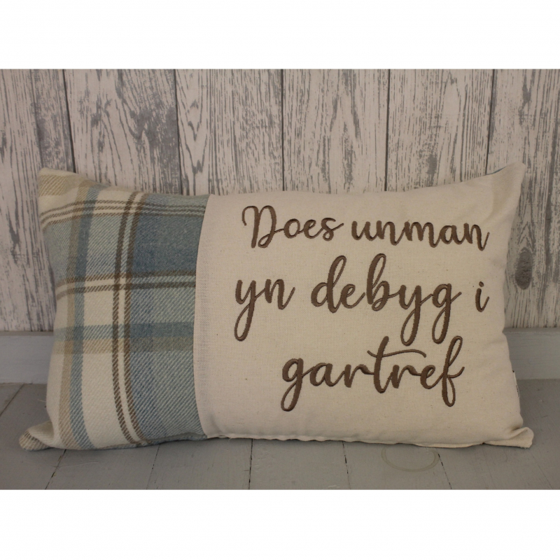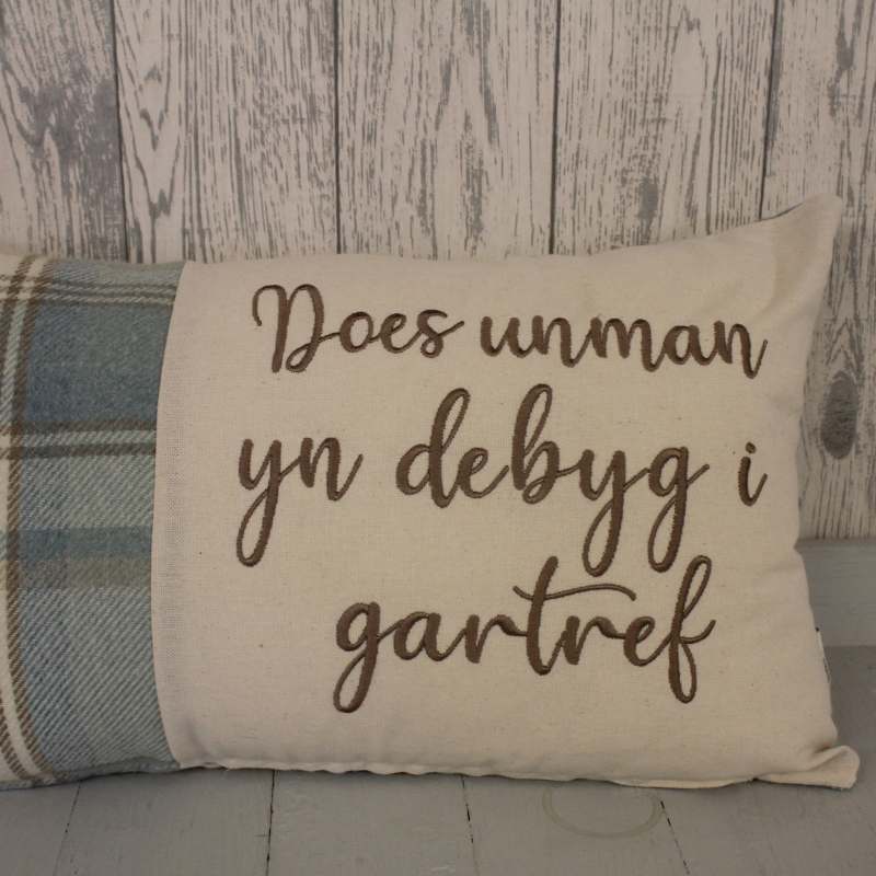 Welsh quotes is embrodiered in grey on a cream fabric.