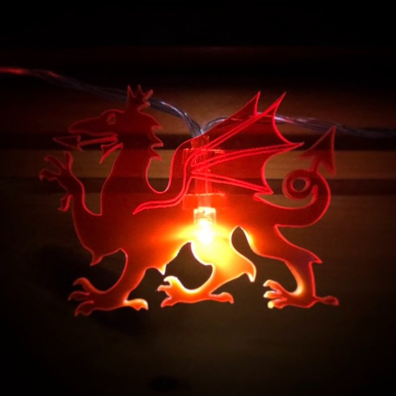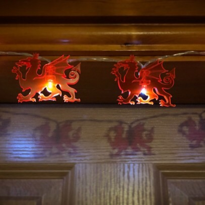 A string of 20 battery operated LED lights with acrylic Welsh dragons.