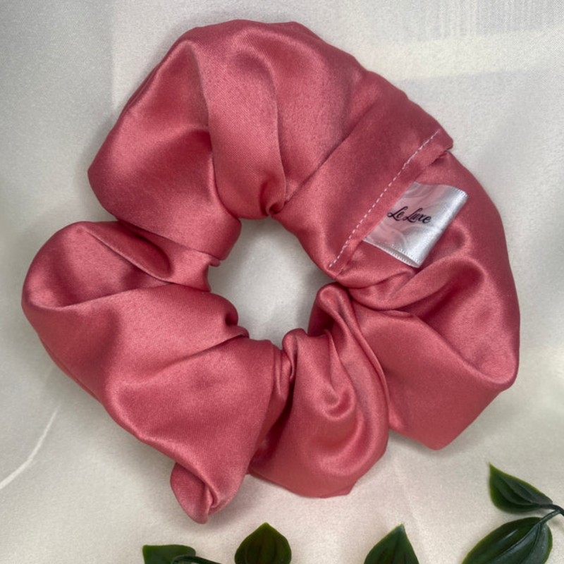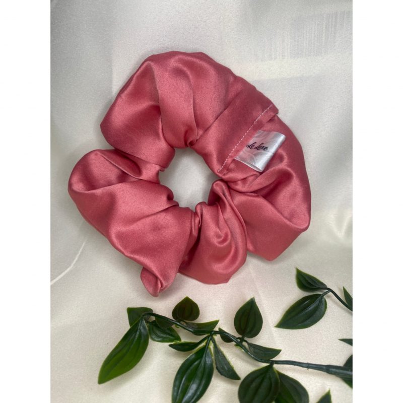 A dusky pink rose scrunchie made from only the best quality duchess silk fabric