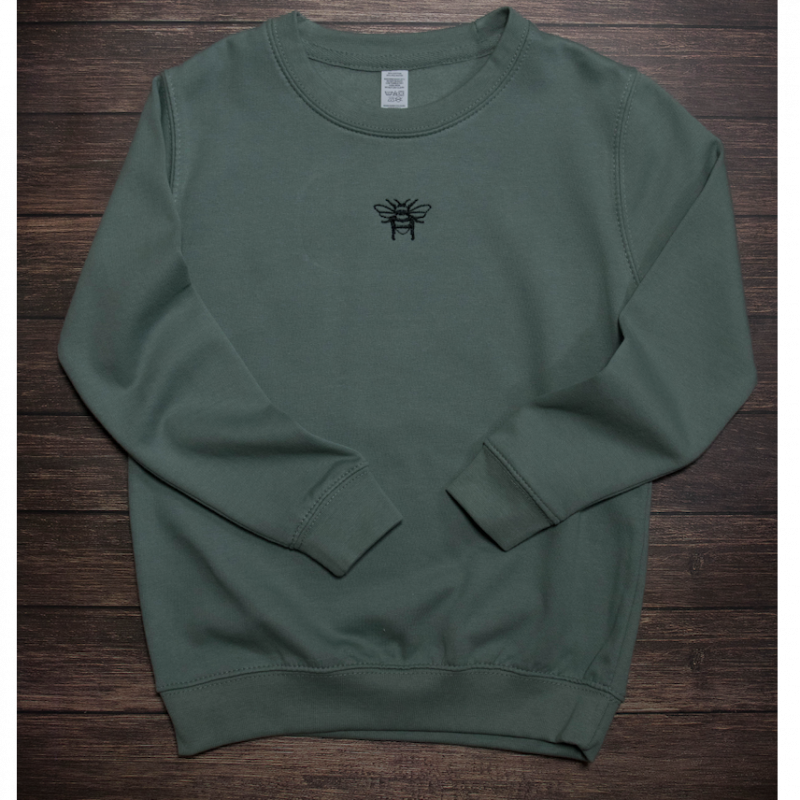 Machine embroidered bee on dusty green sweater