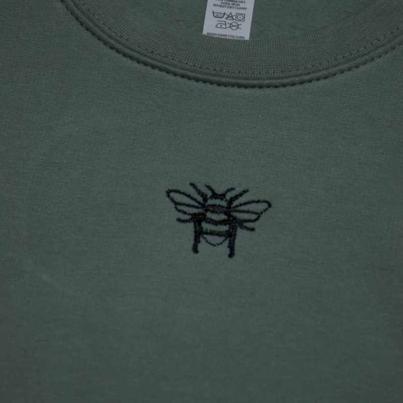 Machine embroidered bee on dusty green sweater