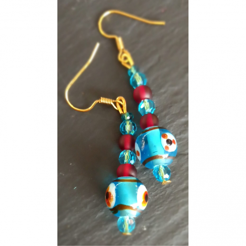 Turquoise blue glass beads with an unusual spot pattern are highlighted by dark red beads and matching small blue crystals. These earrings are unusual and pretty.