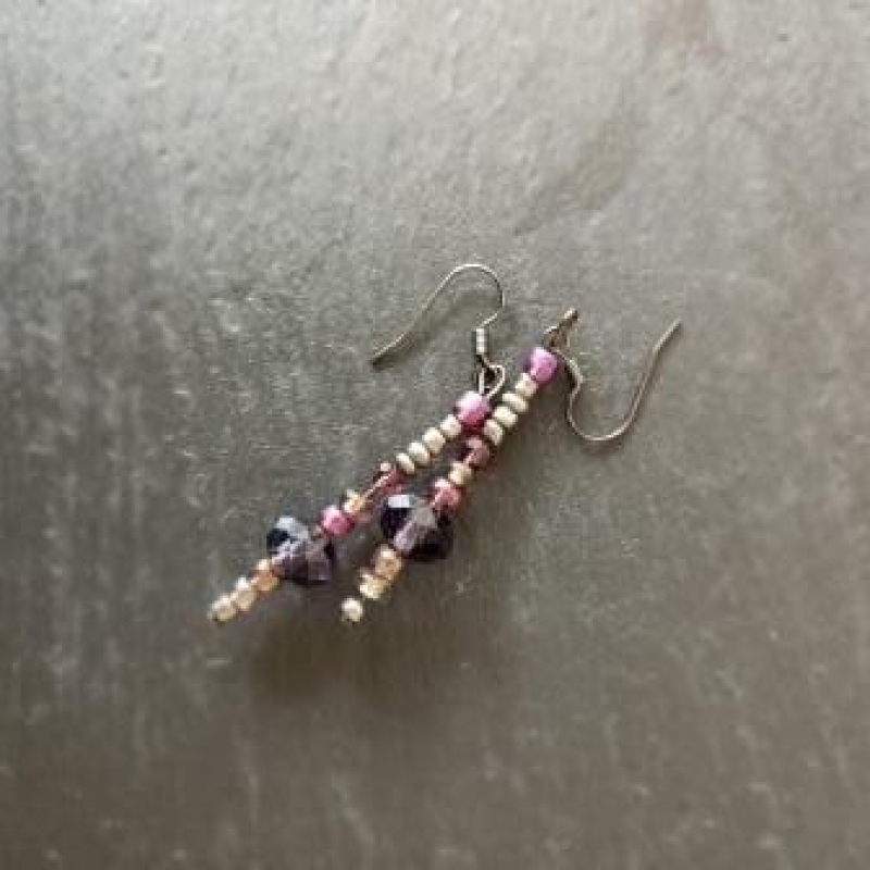 Beautiful handmade purple drop earrings featuring amethyst coloured crystals highlighted with purple and silver small beads