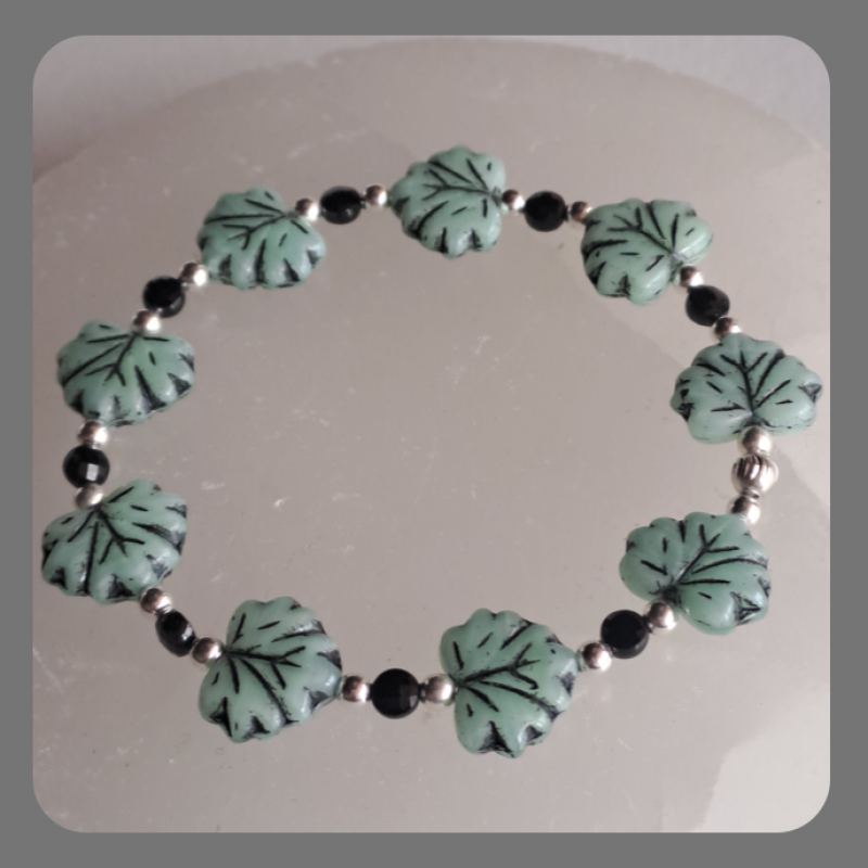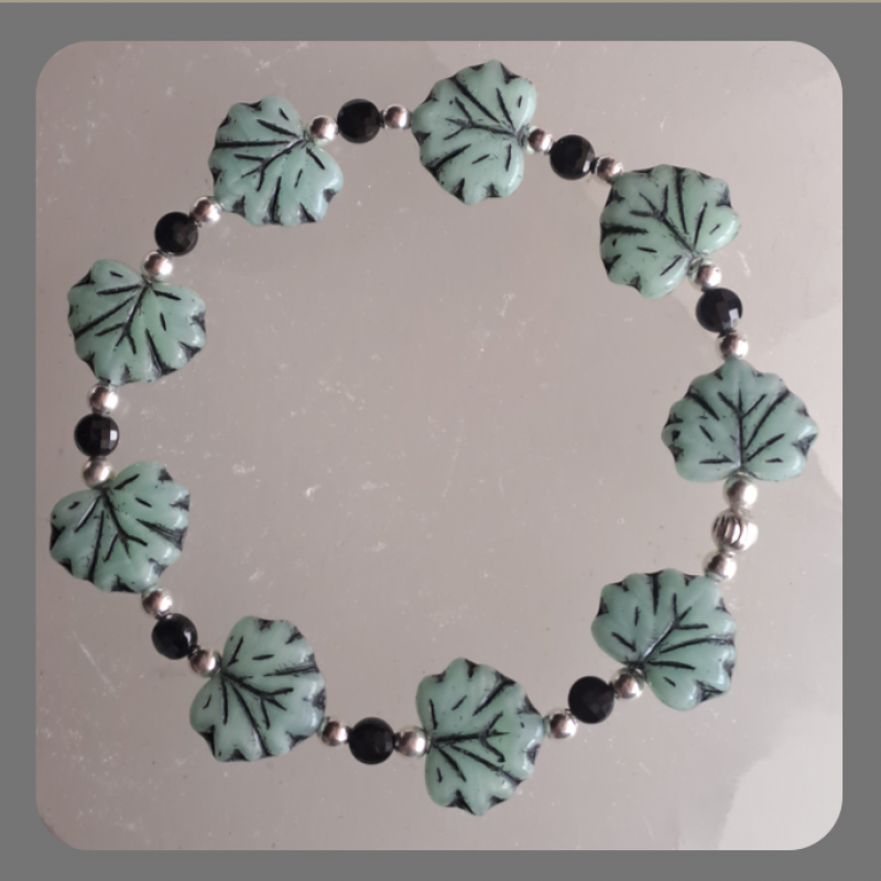Pretty bracelet made with pastel coloured Czech glass leaves, Black Spinel and sterling silver.