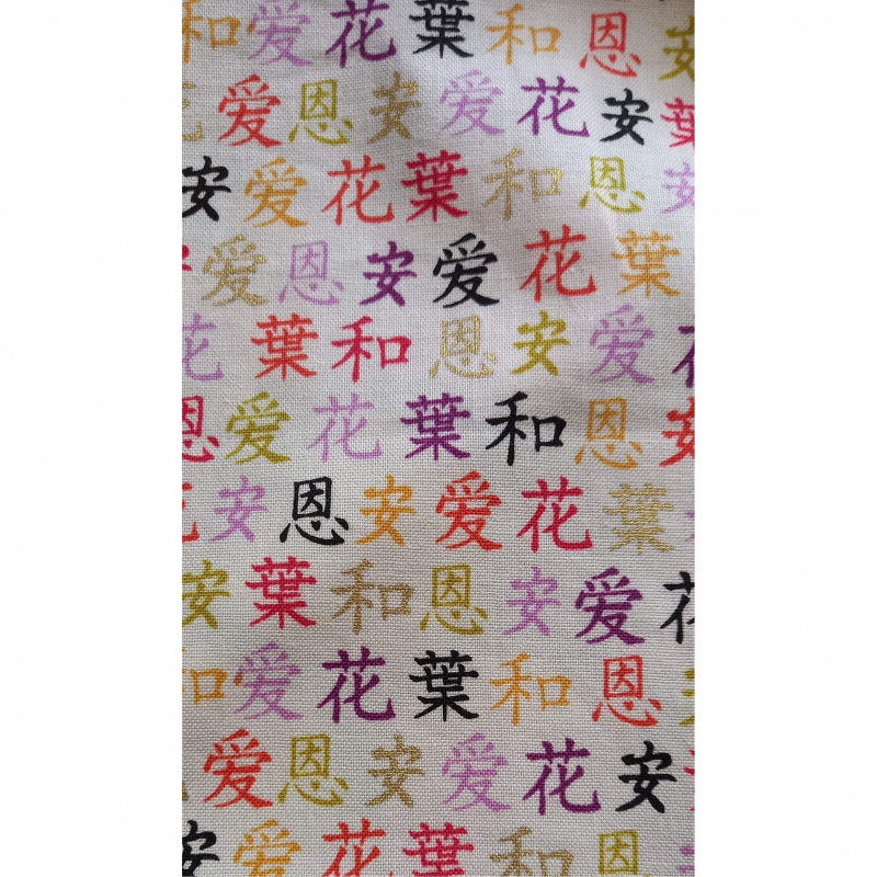 One side features a stunning hexagon pattern in black with purples, greens and pinks to name just a few. The other side has a lovely contrasting fabric with a white background and colourful Asian writing.