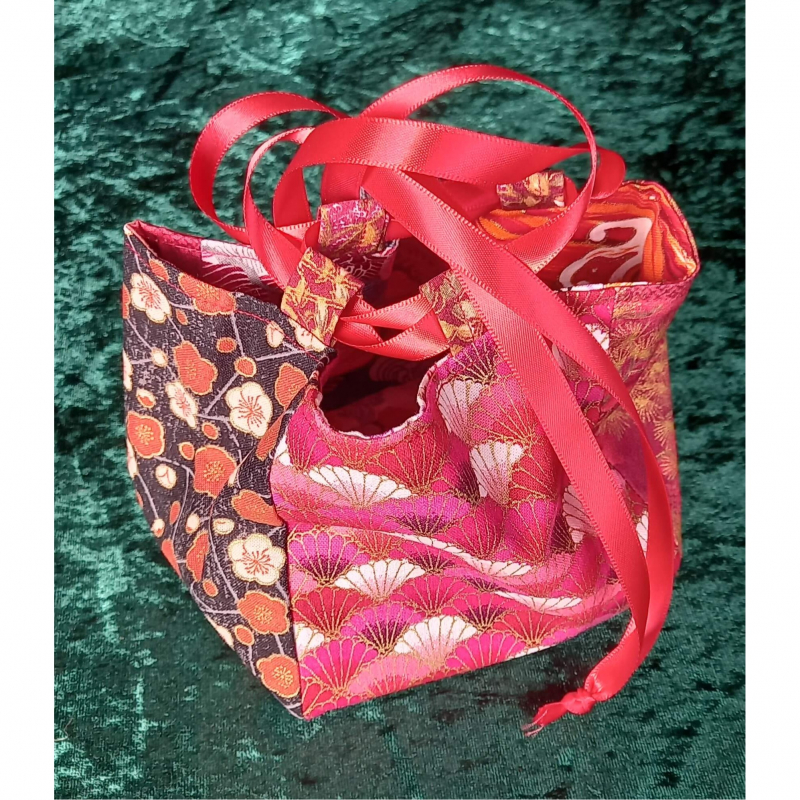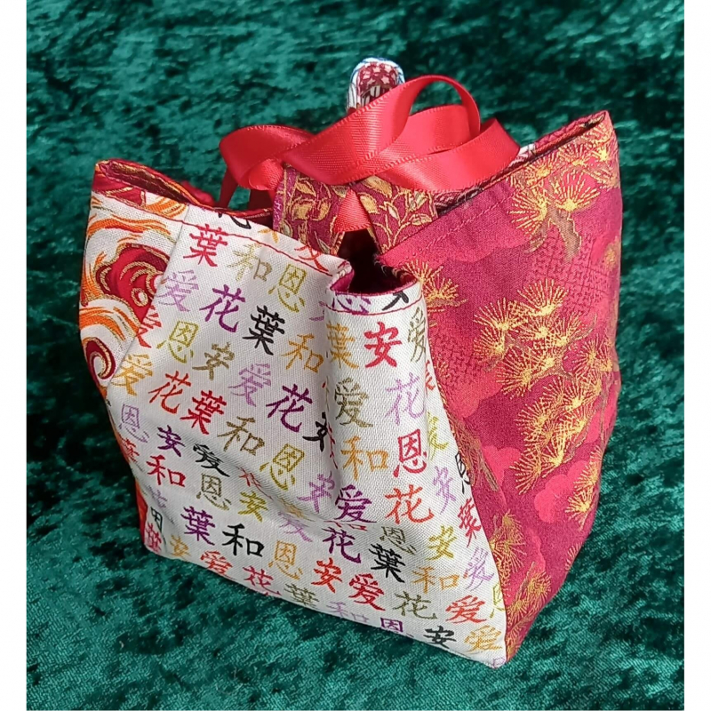 Stunning Japanese Rice Bag (Komebukuro) in beautiful Japanese fabrics with multi coloured panels and gold detailing. Finished with a beautiful red satin ribbon tie.