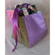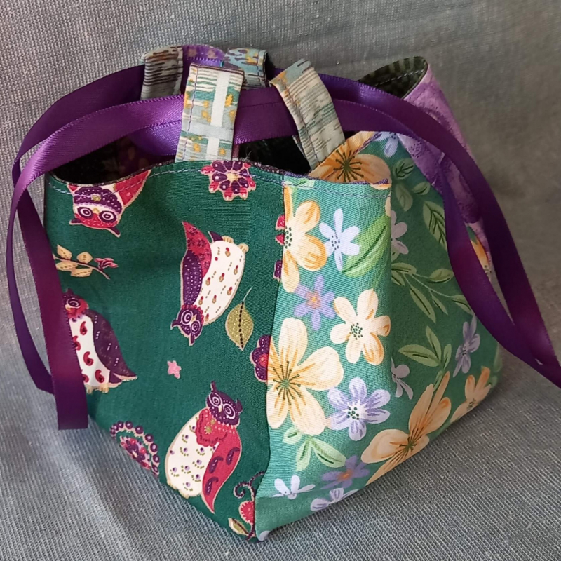 Stunning Japanese Rice Bag (Komebukuro) in shades of green and purple cotton with a beautiful purple satin ribbon tie. This bag is also reversible and can be used for many purposes. We like to use ours as gift bags for the special people in our lives.