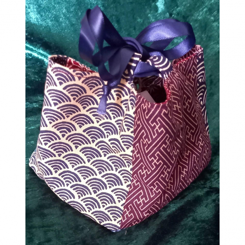 Beautiful Japanese Rice Bag (Komebukuro) in fantastic Japanese printed fabric with a navy satin ribbon tie. The fabric panels feature sashiko style prints in navy, blue, purple and brick red. This bag is also reversible and can be used for many purposes. We like to use ours as storage or as gift bags for the special people in our lives.