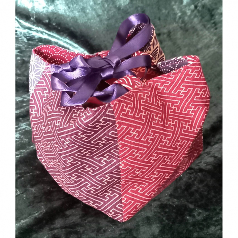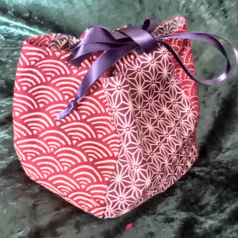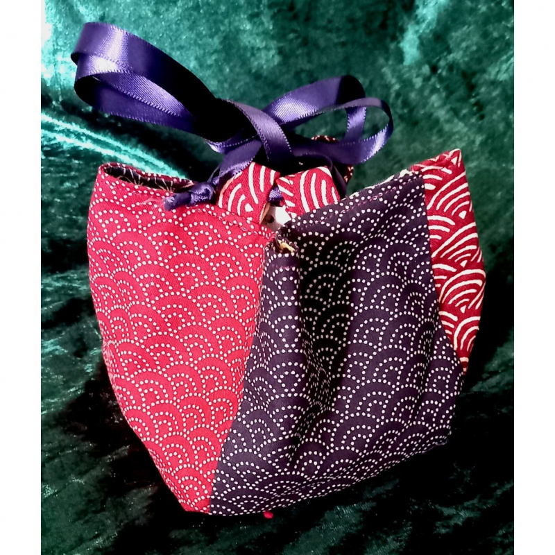 Beautiful Japanese Rice Bag (Komebukuro) in fantastic Japanese printed fabric with a navy satin ribbon tie. The fabric panels feature sashiko style prints in navy, blue, purple and brick red. This bag is also reversible and can be used for many purposes. We like to use ours as storage or as gift bags for the special people in our lives.