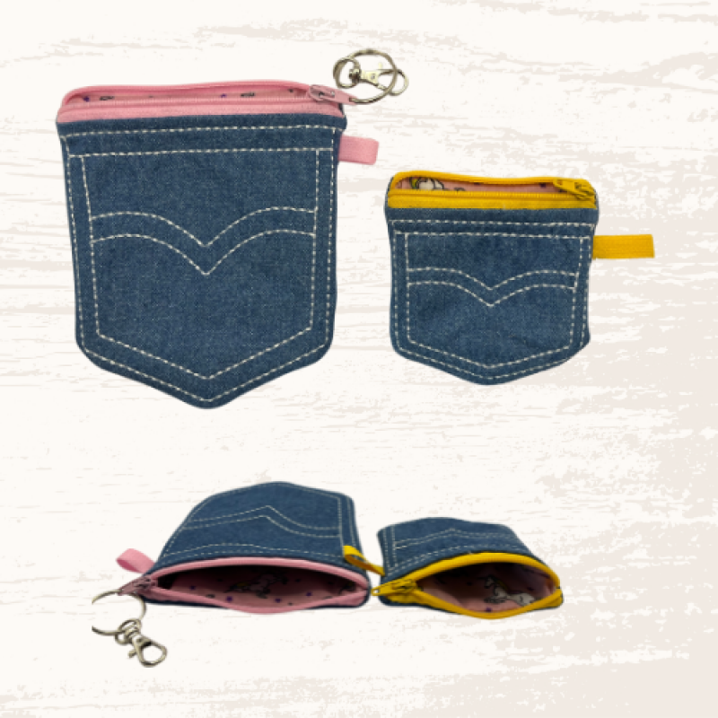 This lovely ‘Jeans Pocket’ zip bag is ideal to carry your change and credit cards safe. It has a lobster claw clasp to attach to your bag or keys.