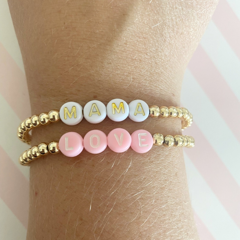 24k Gold Plated Beads with Mama or Love Lettering. Lettering can be in Pink or White & Gold.
