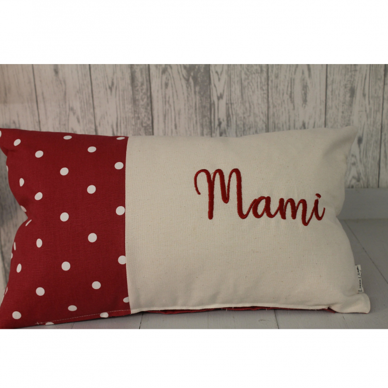 Beautiful Red Fabric embroidered under the name. Cushion with Name of your choice in a hand script style font in red.