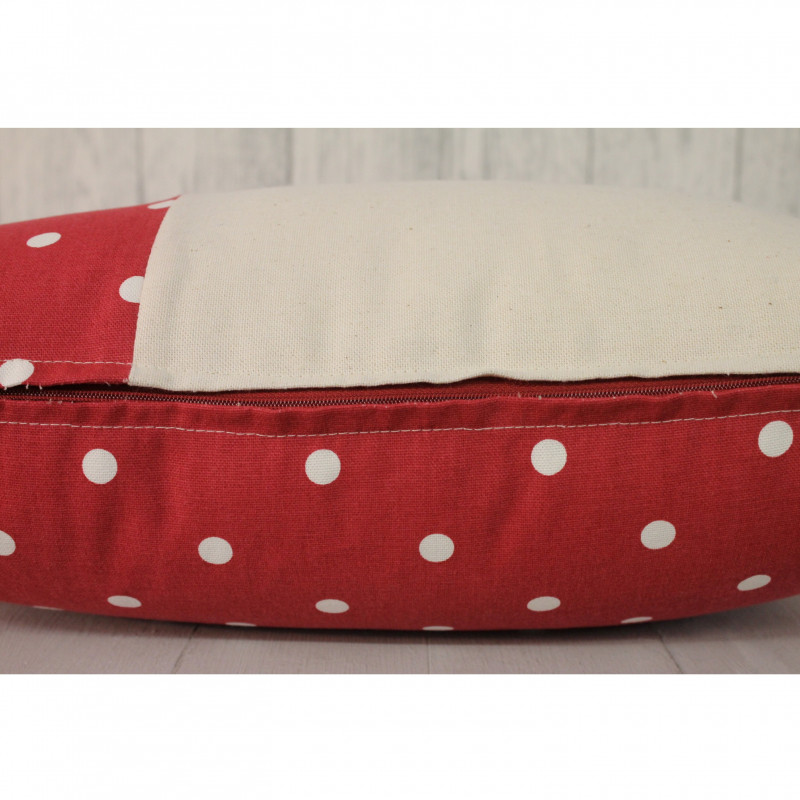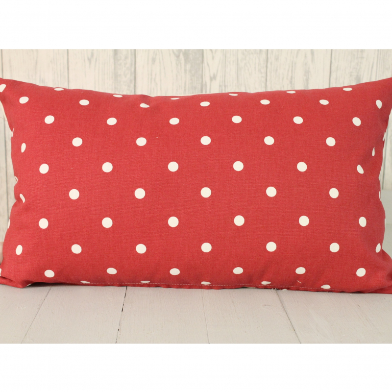 All my Cushions are lovingly made to order using British made fabrics Double sided so the red spotty-fabric is on the back of the cushion.