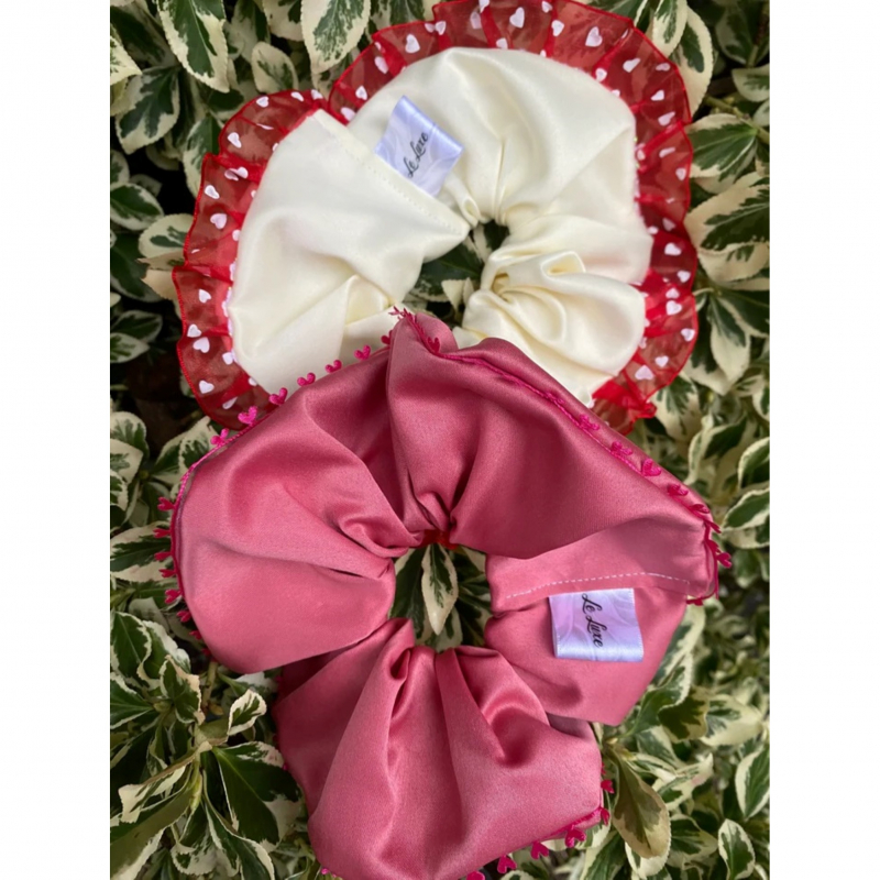 Made with our staple luxury duchess silk fabric we bring you this dusky rose standard sized scrunchie with hot pink sweetheart trim.