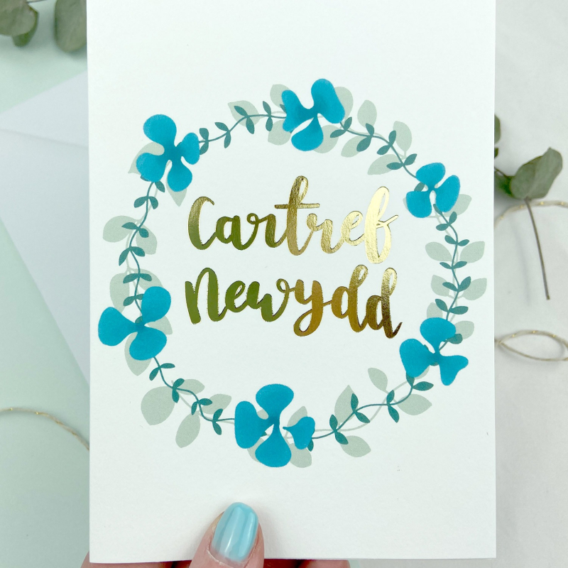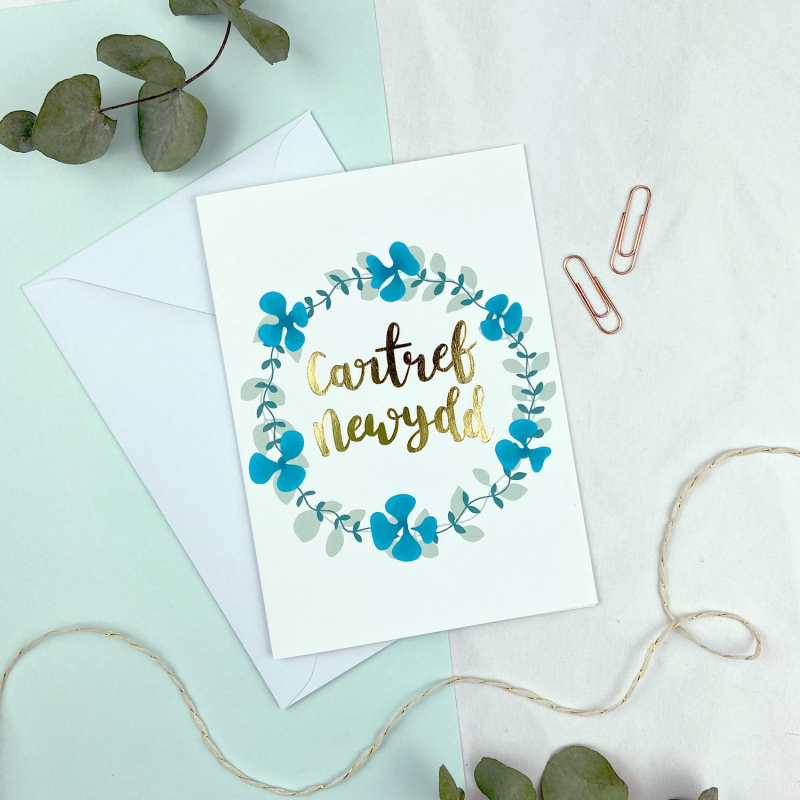 A luxury card featuring hand-written text, original illustration and gold foil. 'Cartref newydd' is Welsh for 'New home'.