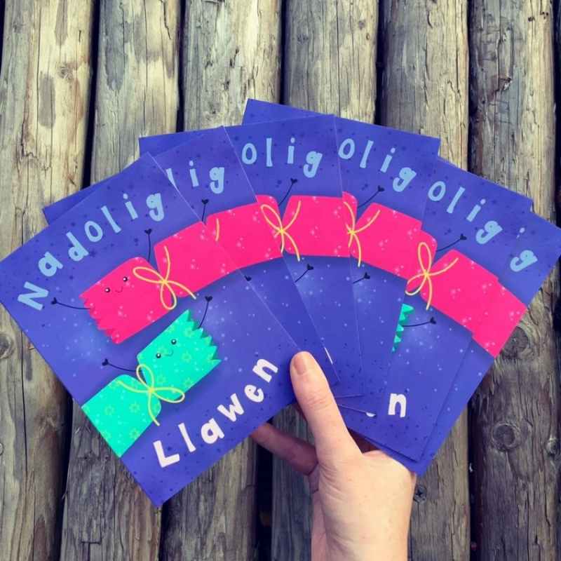 Card Pack of 6 luxury A6 welsh Language Christmas cards. Cards feature a Bright bold colourful fun Christmas cracker design and make perfect cheery cards to send to friends and family this Christmas.
