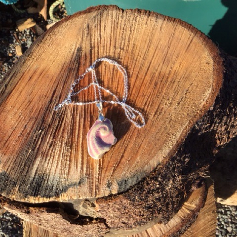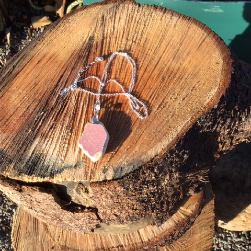 An unique 2 sided pink piece of washed ashore vintage pottery pendant.It was collected on the beautiful shore of Anglesey, North Wales. It is attached to an 18" silver plated chain with a 3” extension chain.They have been tumbling around in the sea for many years. It has not been modified. It is as I found it on the shore. I have cleaned and drilled a hole to attach to a bail on a chain.It is a very unique piece of pottery.