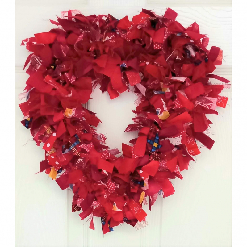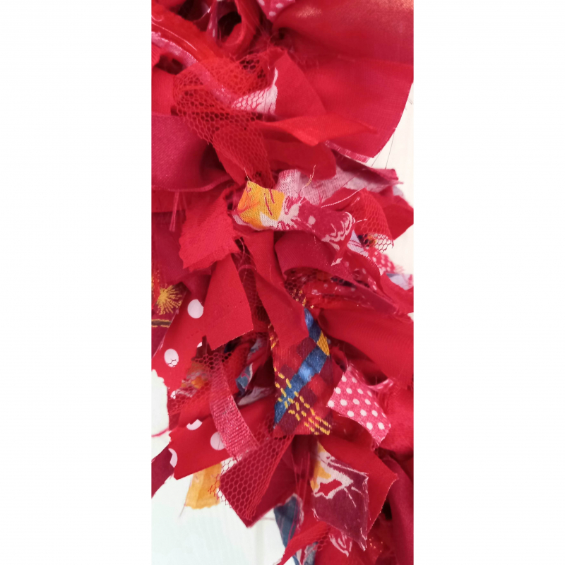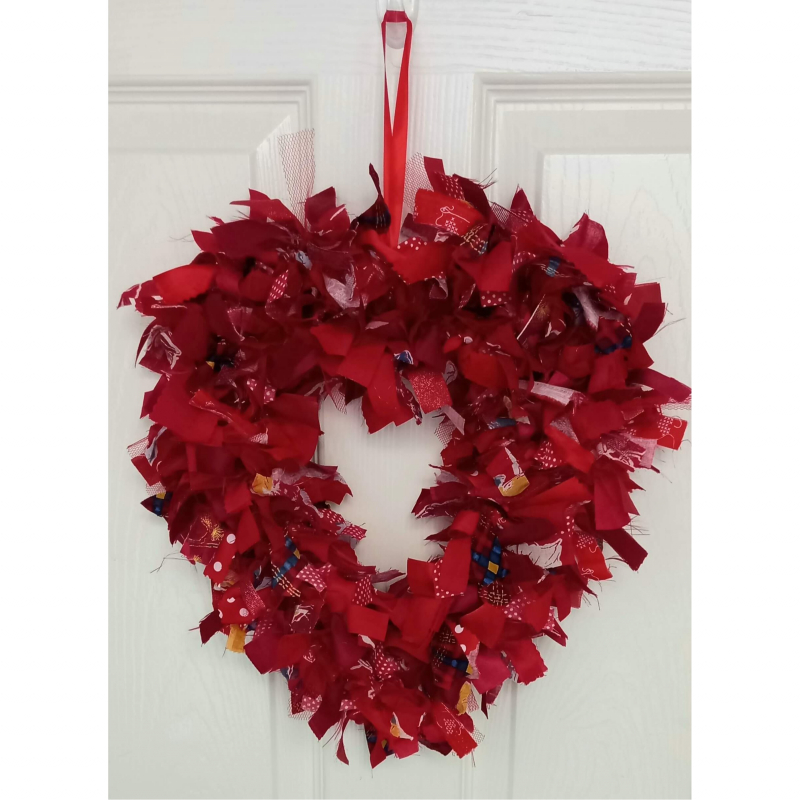 This beautiful handmade unique heart shaped rag wreath features fabric in various shades of red with shimmering gold accents and blue, yellow and white pattern fabrics to make the colours pop.