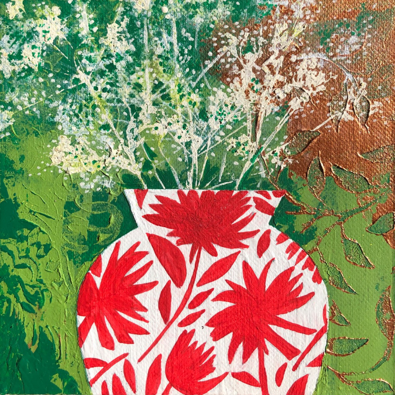 Original mixed media: acrylic paints/emulsion paint/woodblock print/monoprint. Mounted on 300gsm watercolour blank card. Fits 7x7 inch frame. Image size approximately 100x100 mm