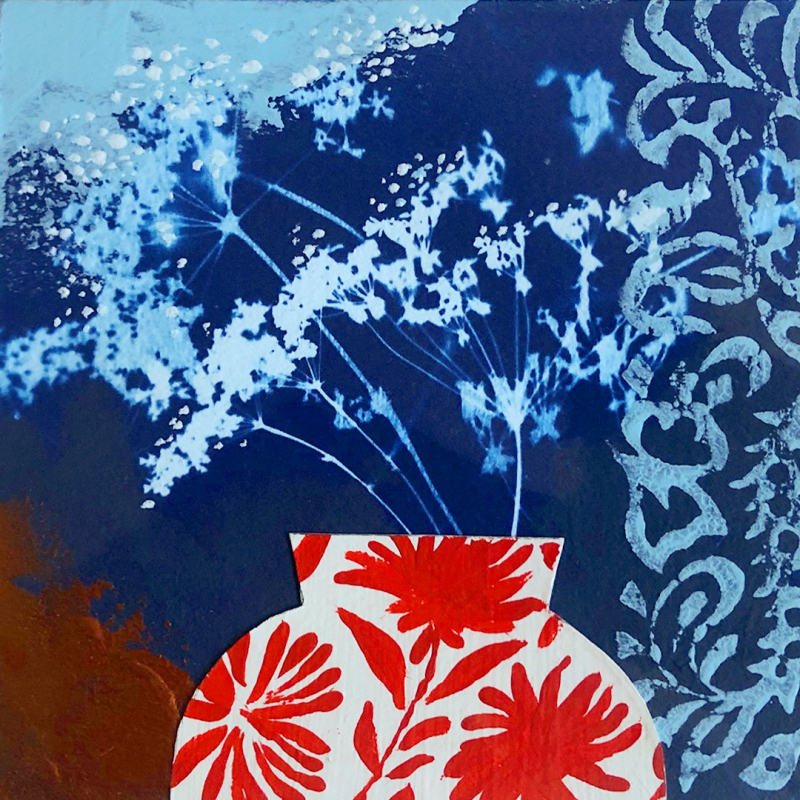 Original mixed media: acrylic paints/emulsion paint/cyanotype/collage/ woodblock print. Mounted on 300gsm watercolour blank card. Fits 7x7 inch frame. Image size approximately 100x100 mm
