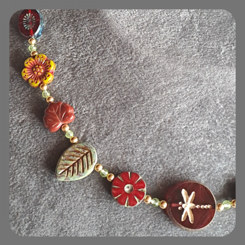 Red, Green, Brown and Gold Czech Glass Floral Dragonfly Necklace with Peridot and Vermeil.