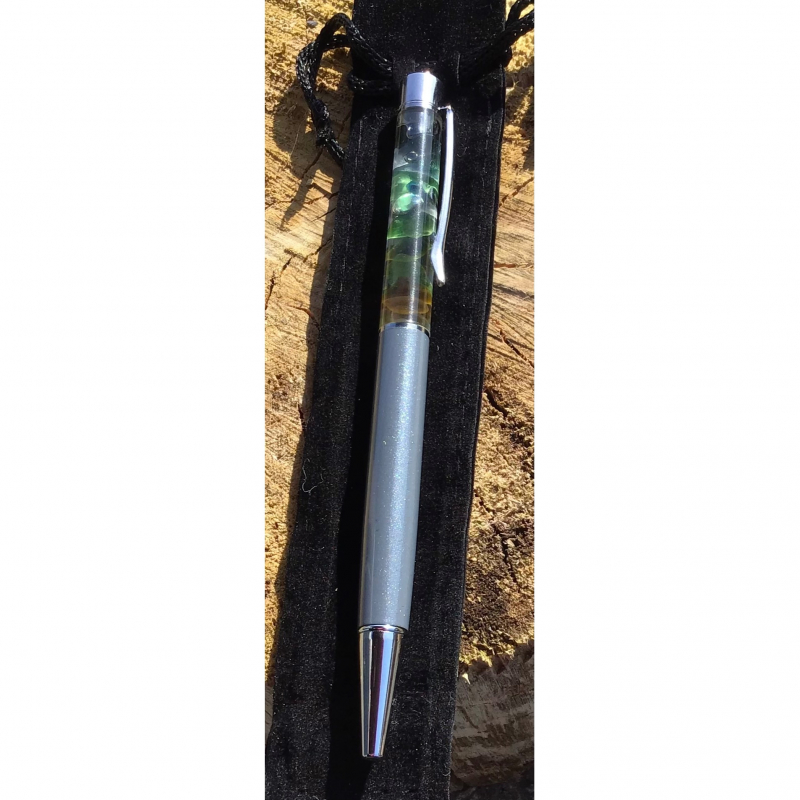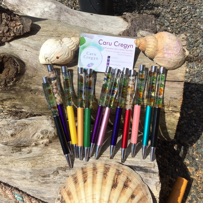 A selection of multi coloured authentic Anglesey seaglass filled pens or seashells filled in separate pens. A metal bodied pen with top half filled with tiny pieces of authentic Anglesey seaglass or if you prefer Anglesey seashells .Included are cowrie shells which are rare to find The pens have black ink.They are lovely to write with in black ink.