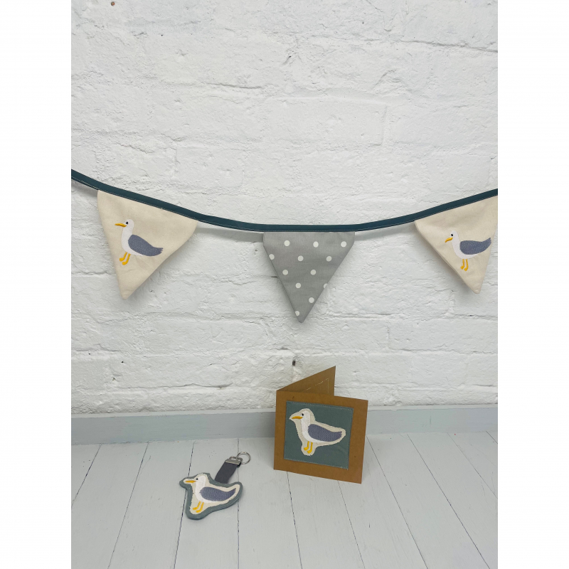 The seagull is embroidered onto cream fabric and then sewn onto grey wool blend felt and mounted onto a brown Kraft card and comes complete with envelope and clear presentation bag .