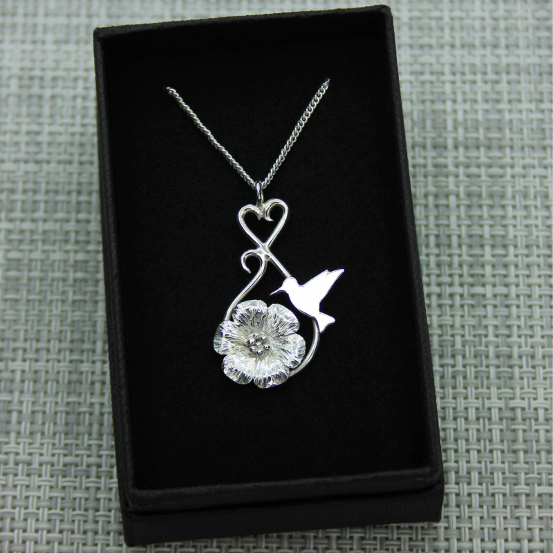 This unique pendant is handcrafted from eco sterling silver. The flower and bird are hand drawn and cut from recycled silver, all sat together on a beautiful unique pendant. This pendant is uniquely handcrafted, and sits on a delicate 45cm/18” curb chain.