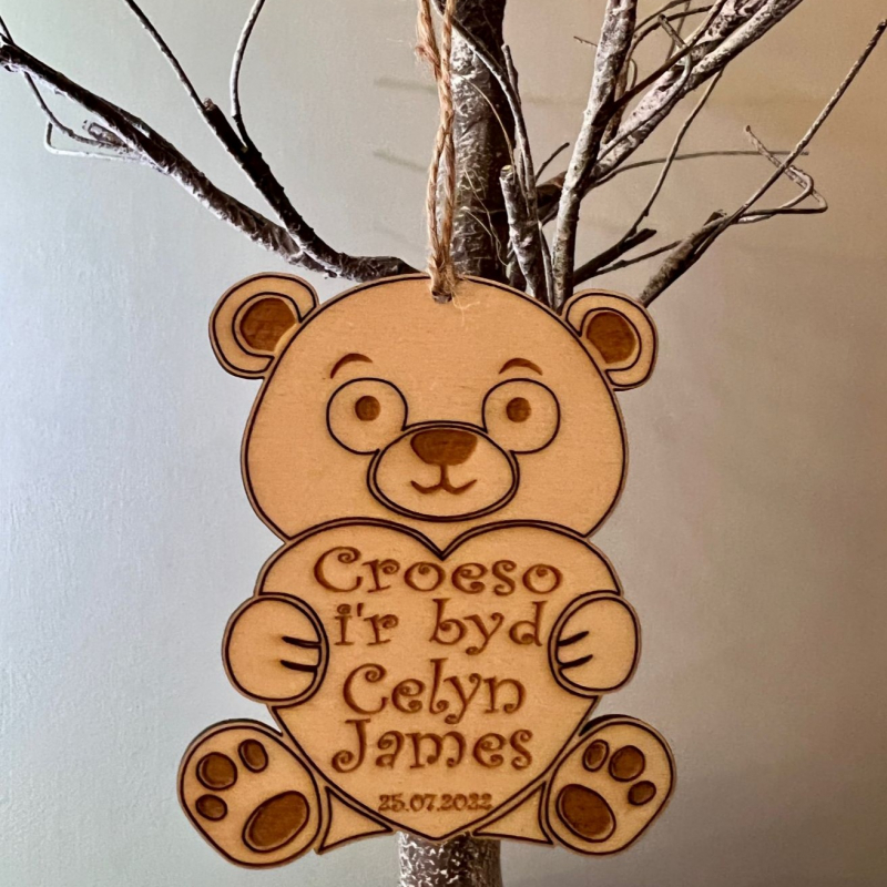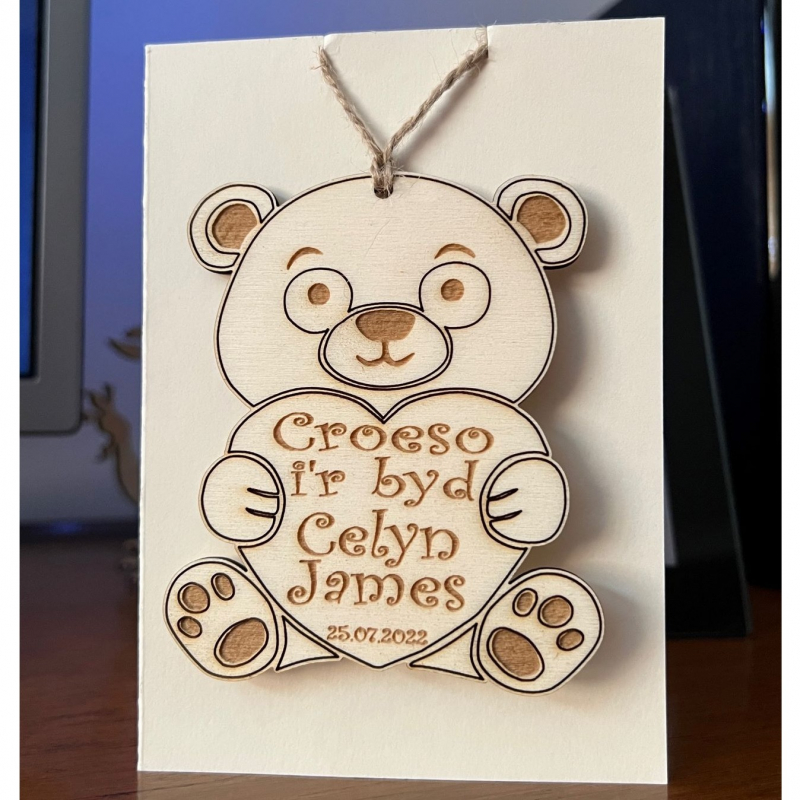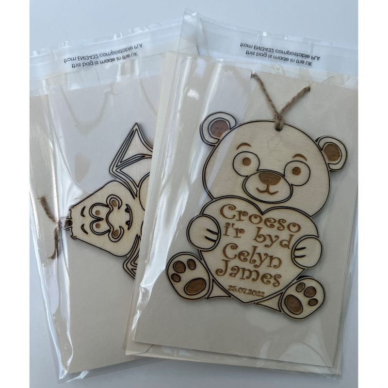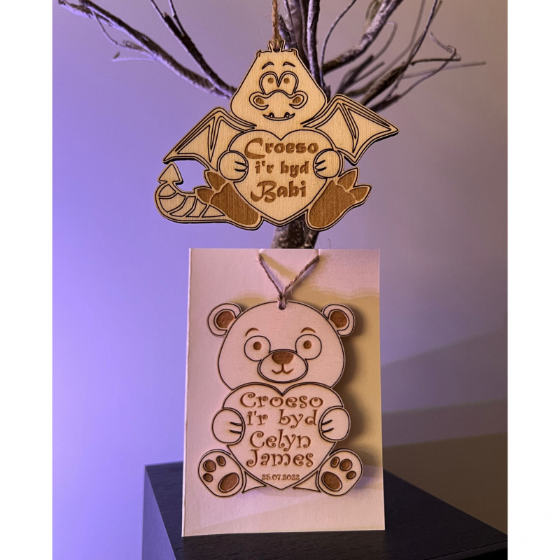 Welcome the new arrival to the world (Croeso 'i'r byd') with our card/ gift in one! The wooden* hanging decoration - either a teddy bear or baby rebel dragon - can be personalised or come with a generic Babi Newydd or Croeso i'r Byd Babi message. Just let us know the name and birth date, and we'll do the rest!