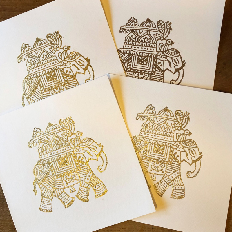 Handprinted vintage, Indian woodblock print of elephant. Mounted on 8x8 inch, 300gsm watercolour blank card. Ideal for framing. Available in gold, silver, pewter, bronze, black and yellow ochre.
