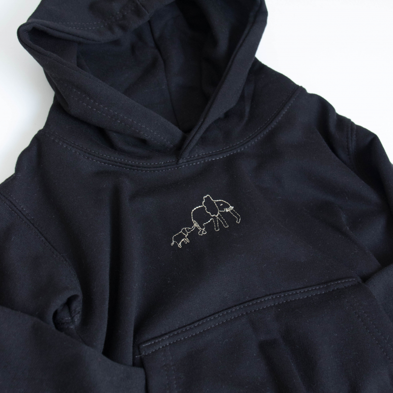 Machine embroidered elephants on black hoodie