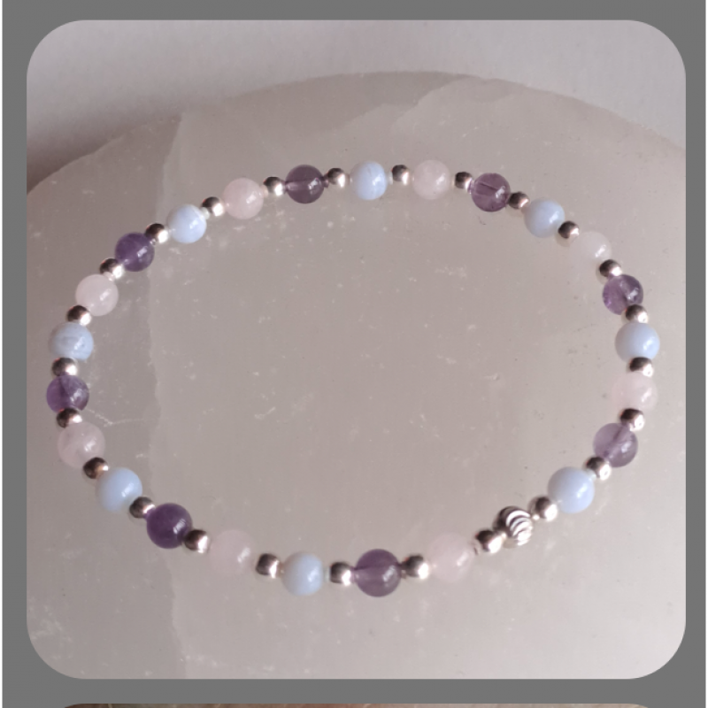 Blue Lace Agate, Amethyst, Rose Quartz and Rose Silver bracelet made with sterling silver beads. The bracelet measures approximately 6.5 inches.