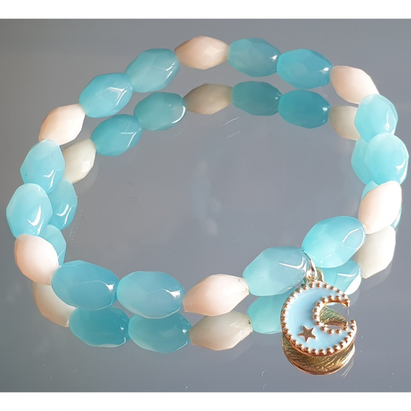 Bracelet made with upcycled blue and white beads and a blue moon charm.