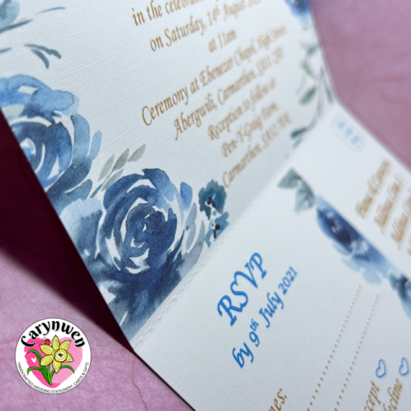 Introducing "Cariad Rhosyn Glas" – a stunning Welsh-inspired wedding invitation designed to capture hearts. This tri-fold invitation features an exquisite blue rose motif, symbolising love and romance. Crafted with meticulous attention to detail, each invitation is printed on high-quality linen card-stock and includes a tear-off RSVP card for added convenience.