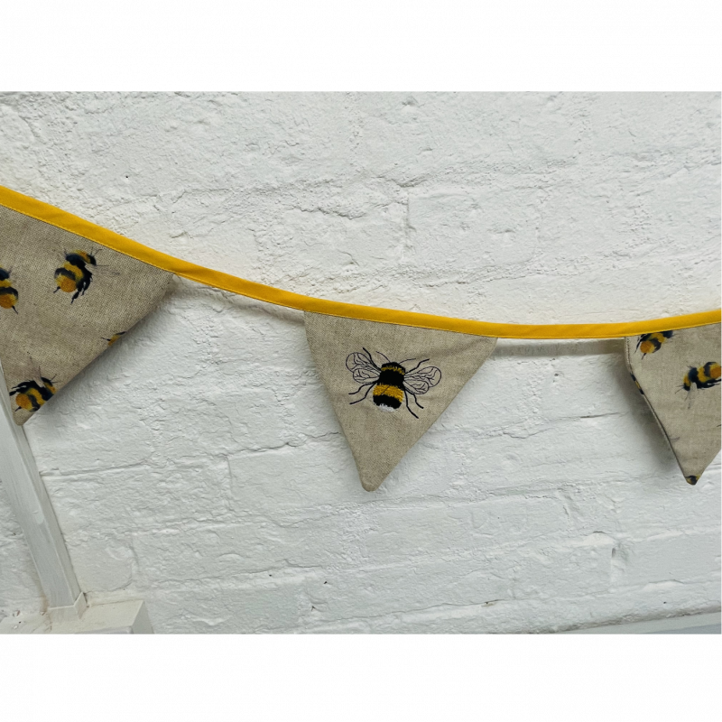 A super cute 5 Flag bee bunting . The bunting is approx 1M with extra on each end for hanging. The cute bumble bee is embroidered on alternate flags bee fabric in the other . Bunting flags are approx 7” and come on mustard bias binding.