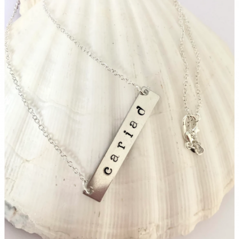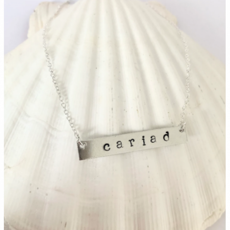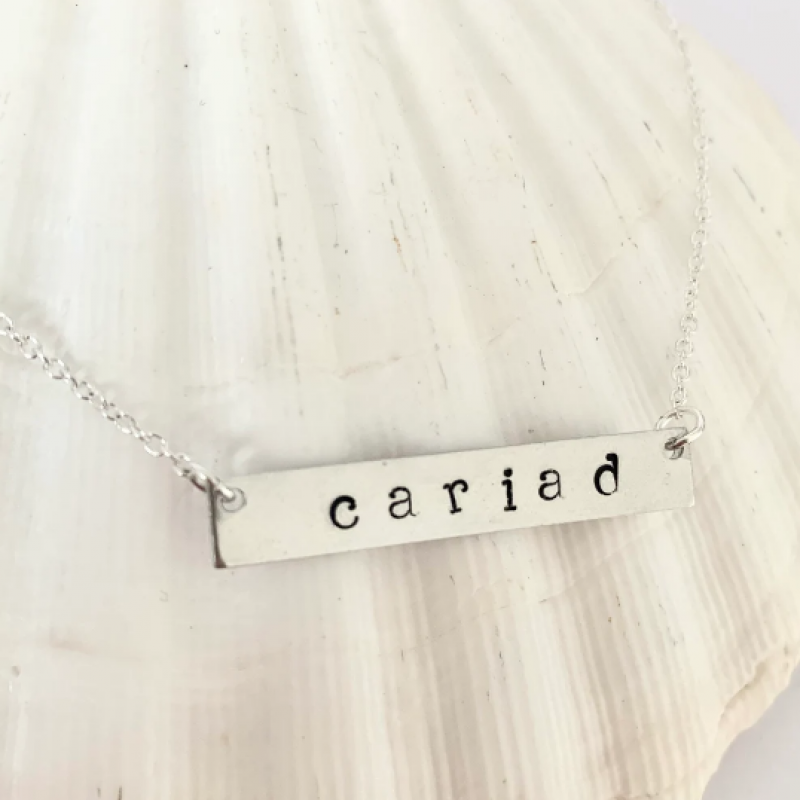 This pretty necklace is hand stamped with a Welsh word just for you. This necklace reads ‘cariad’ which is the Welsh word for ‘love’. This is a great minimalist necklace and will compliment any outfit. Perfect to gift or keep for yourself!